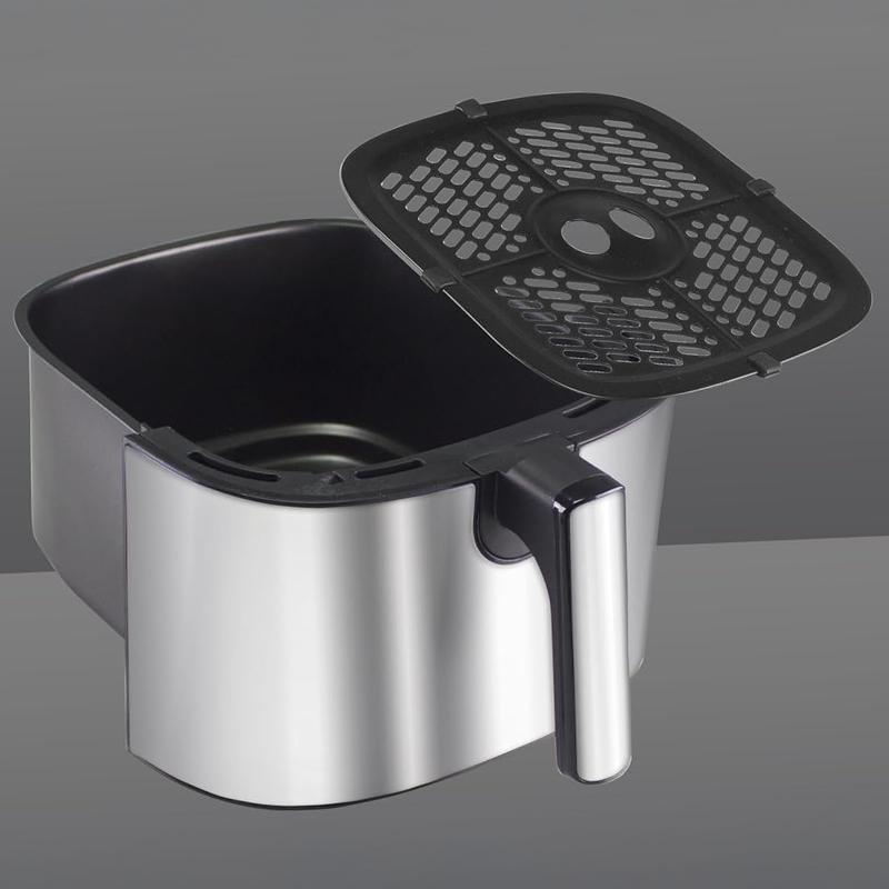 Această friteuză practică cu aer cald, cu un design elegant argintiu, este ideală pentru prăjirea sănătoasă fără ulei sau cu o cantitate minimă de ulei.