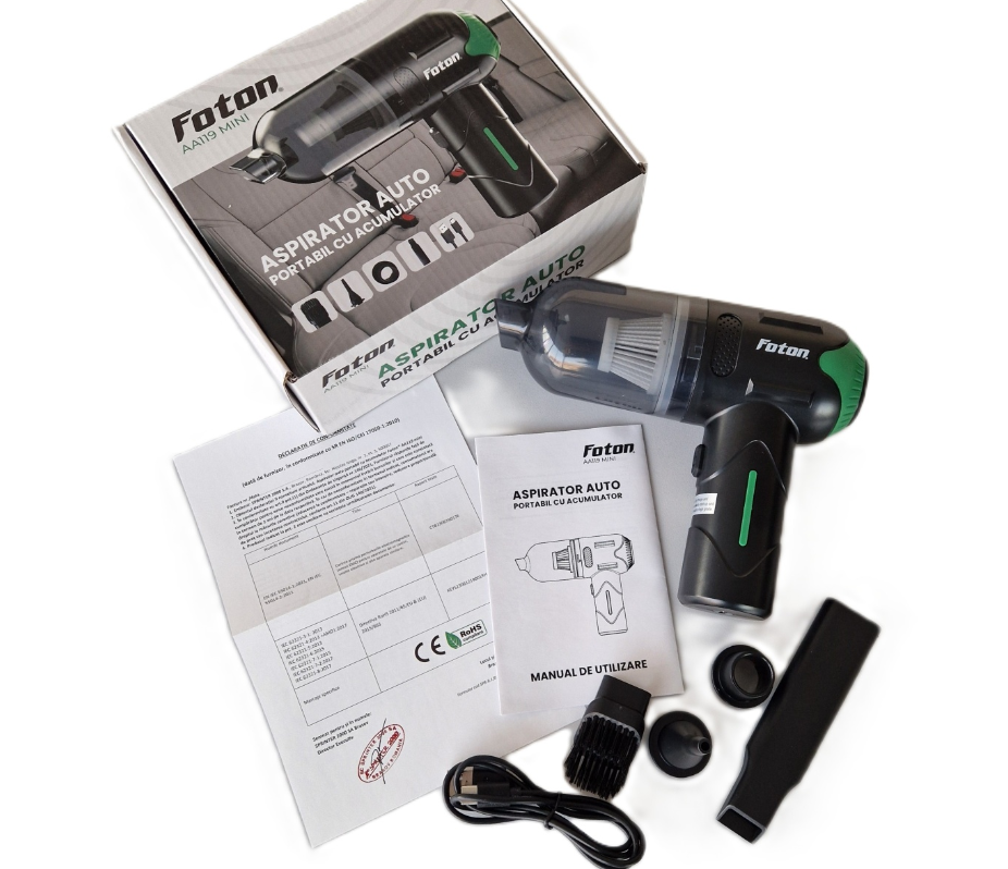 Continut pachet: Aspirator Foton AA119 Mini + Cablu incarcare USB - USB-C + Perie aspirare + Tija pentru aspirare in spatii inguste + Accesoriu umflare ingust + Accesoriu suflare/umflare lat + Instructiuni si certificat garantie in limba romana