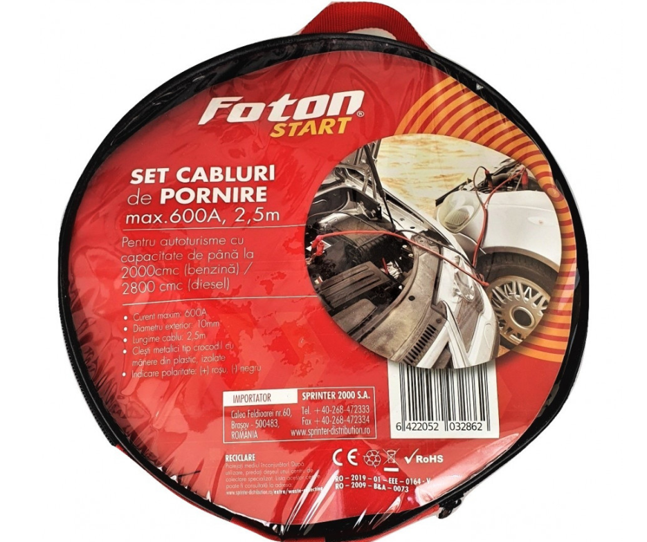 SET cabluri pentru pornire vehicul sau pentru transfer curent marca FOTON™. Cabluri cu sectiune de 16mm2 si lungime de 2.5 m, ideale pentru pornirea motoarelor pe benzina pana la 2800cm3 si diesel pana la 2000cm3. Suporta transfer de curent de maxim 600A, pe durate scurte.