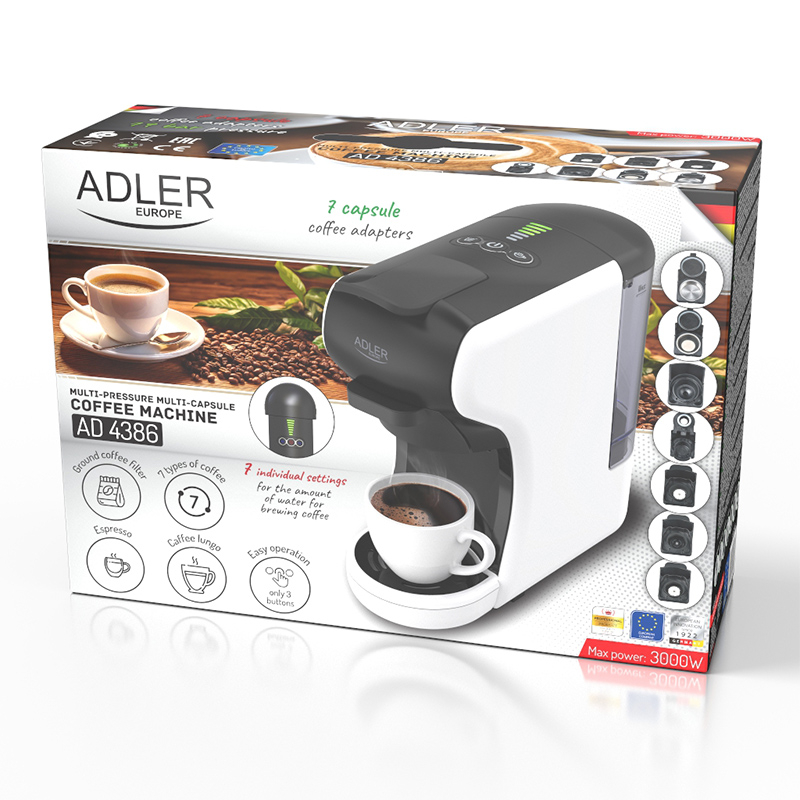 Espressorul cu capsule multiple Adler AD 4386 este o soluție versatilă pentru iubitorii de cafea care apreciază confortul, varietatea și gustul excepțional. Espressorul acceptă până la 9 dintre cele mai populare sisteme de capsule disponibile pe piață, precum și cafea măcinată, oferindu-vă libertate deplină de a vă bucura de stilul preferat de cafea.