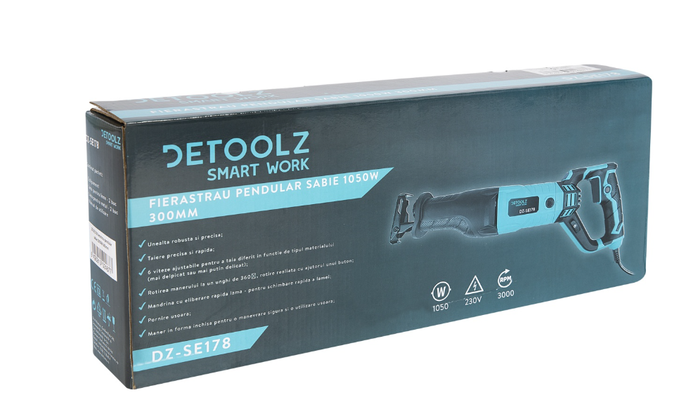 Fierastraul pendular sabie 1050W, 300mm, Detoolz DZ-SE178 este potrivit atat pentru toaletarea pomilor, a tufisurilor din gradina, taierea de tevi, cat si pentru a monta pereti din gips-carton. Fierastraul electric de tip sabie Detoolz DZ-SE178 are o putere de 1050W si este potrivit chiar si pentru locurile greu accesibile. Manerul este rotativ si poate fi ajustat in functie de nevoi. Cu lungimea cursei de taiere de 25 mm, ferastraul pendular tip sabie, Detoolz DZ-SE178 asigura performante excelente de taiere. Fierastraul electric de tip sabie Detoolz DZ-SE178 dispune, de asemenea, de un variator de viteza in 6 trepte pentru a ajusta viteza in functie de materialul taiat.