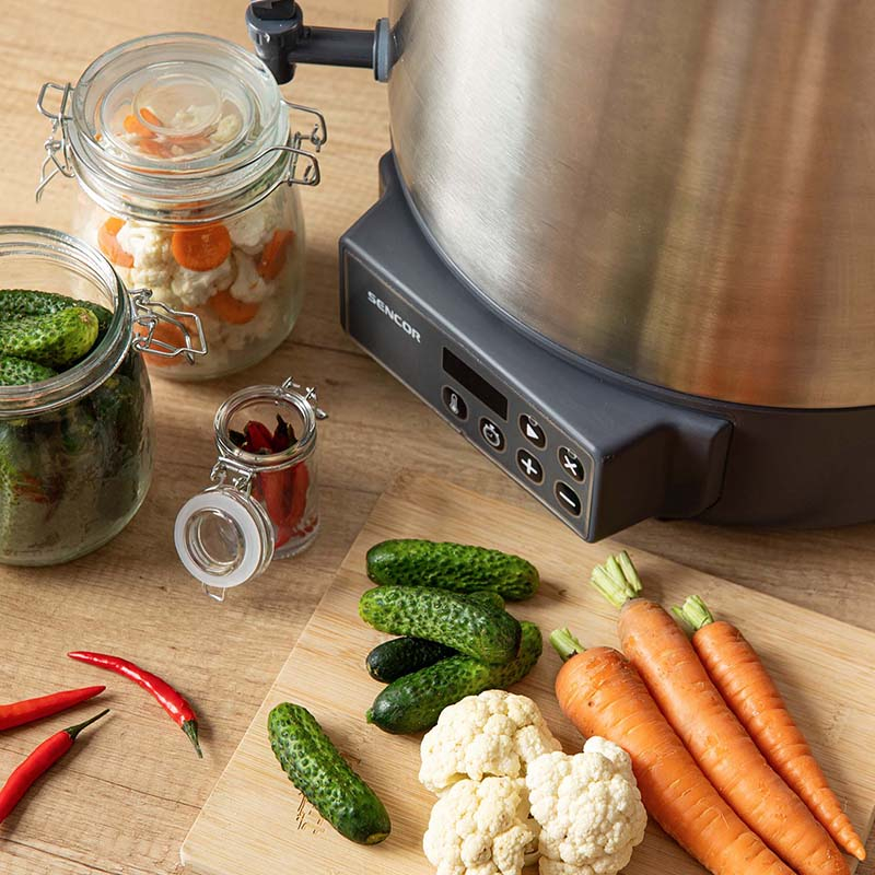 Puteți manca, congela și, bineînțeles există li posibilitatea de a conserva fructe și legume. Este un recipient pentru conservare și, pe lângă compoturi, marmelade și piureuri, uteți conserva și diverse sosuri, carne, ciorbe și multe altele. Poate ține până la 14 borcane mari simultan, iar aceasta este deja o porție decentă de produse alimentare. Cel mai mare beneficiu al conservelor acasă este în principal conștientizarea a aceea ce conservi!