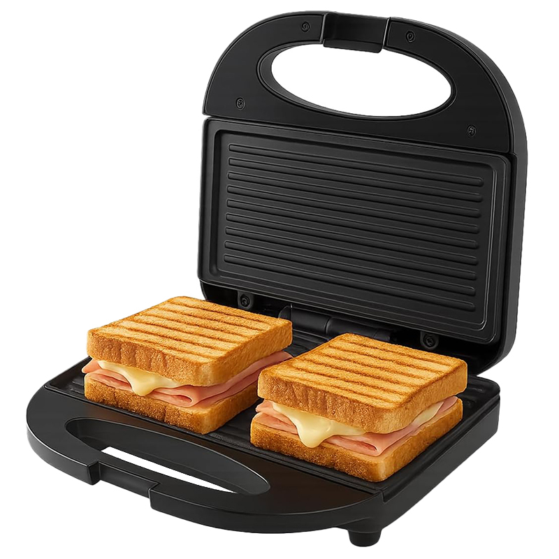 Aparat compact cu corp din bachelită și plăci de grătar antiaderente pentru curățare ușoară.