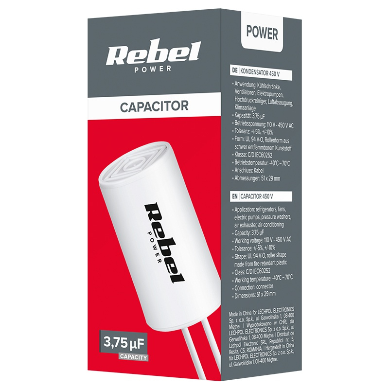 Condensator pentru motor monofazat, cu fire, pentru aplicaţii cum ar fi: frigidere, ventilatoare, pompe electrice, motoare electrice, etc.