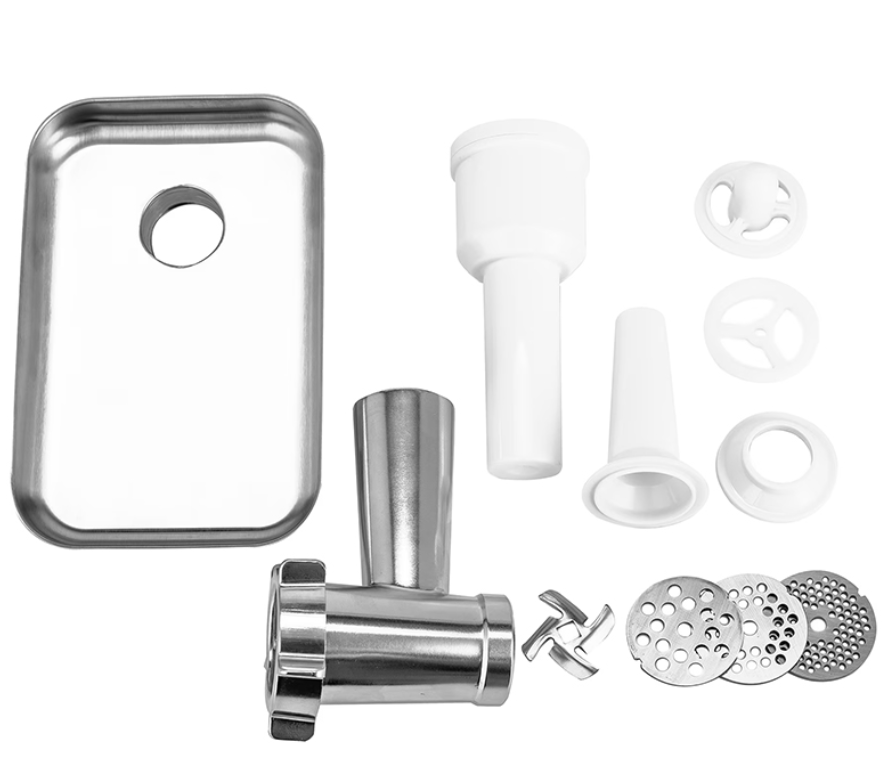 Un aparat 2 in 1 cu care veti economisi spatiu in bucatarie datorita functionalitatii lui. Acesta vine la dumneavoastra cu accesorii de framantare, tel si paleta de amestecare detasabile si con pentru prepararea celor mai gustosi carnati in propria bucatarie.