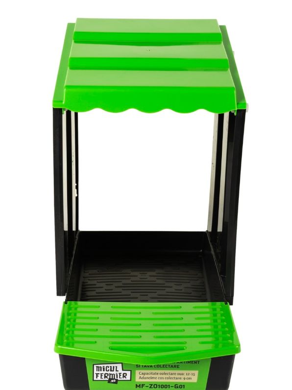 Cuibar Micul Fermier, model 1C, dotat cu tavă de colectare pentru ouă. Asigură un spațiu igienic și sigur pentru găini, fiind ușor de curățat și întreținut. Ideal pentru ferme mici și gospodării.