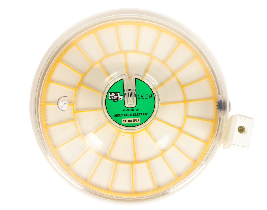 Incubator electric Micul Fermier capacitate 35-105 oua, MF-ZO1006-G01 este construit pe principiul incubatorului de suprafata, ouale fiind asezate intr-un singur strat. Carcasa, din materiale plastice termoizolante, asigura pastrarea temperaturii interioare. lncalzirea este asigurata de o rezistenta electrica termostatata. Omogenizarea aerului in interior este facuta de un motor electric. Controlul temperaturii este asigurat de un circuit electronic.