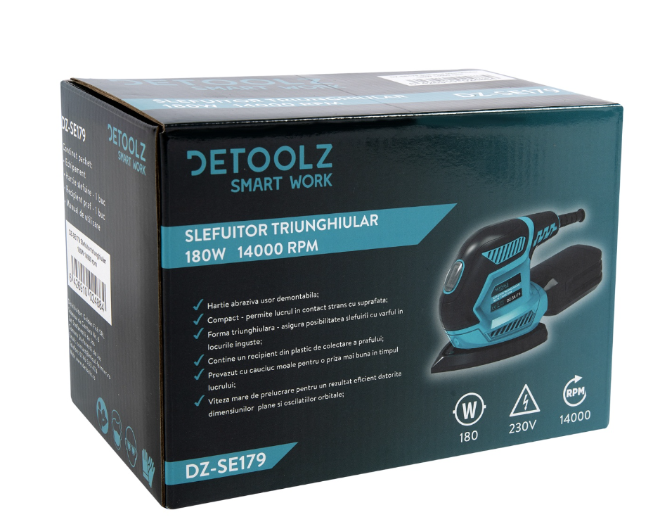 Slefuitorul triunghiular 180W, 14000rpm, Detoolz DZ-SE179 este destinat slefuirii uscate a lemnului, plasticului, metalului, materialului de umplutura, precum si a suprafetelor acoperite, cu viteza mare de prelucrare pentru un rezultat eficient datorita dimensiunilor plane si oscilatiilor orbitale. Forma triunghiulara asigura posibilitatea slefuirii cu varful in locurile inguste. Contine un recipient din plastic de colectare a prafului pentru a reduce praful rezultat.