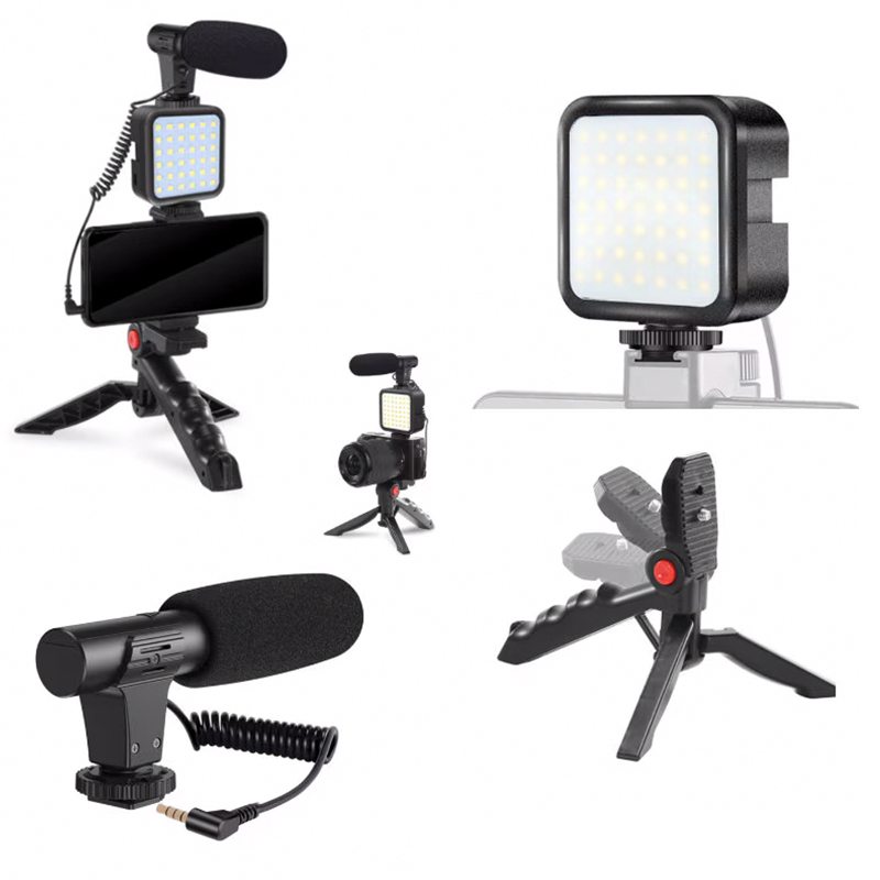 Acest kit de vlogging este conceput pentru a îmbunătăți videoclipurile create cu un sunet și o iluminare mai bune, atât în interior, cât și în exterior. Dispune de un microfon universal care funcționează cu orice smartphone sau cameră, o lumină LED cu 36 de LED-uri super luminoase, un mâner de transport care poate fi folosit ca trepied și un suport încorporat care îți permite să montezi nu doar telefonul, ci și lumina și microfonul.