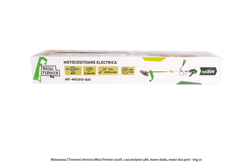 Motocositoarea Micul Fermier MF-MX1013-G01 este proiectată pentru lucrări de întreținere a spațiilor verzi, combinând puterea unui motor brushless 20V cu confortul oferit de mânerul dublu ergonomic. Alimentată de doi acumulatori Li-Ion 20V / 4Ah, aceasta oferă stabilitate și control sporit în timpul utilizării, ideale pentru suprafețe mai mari și tăieri precise.
