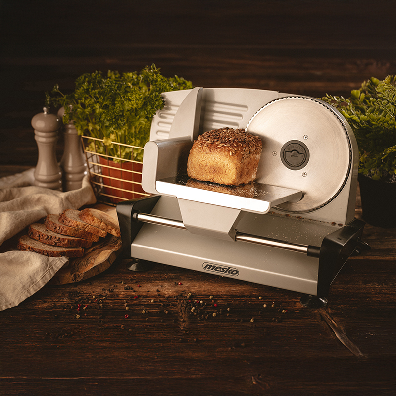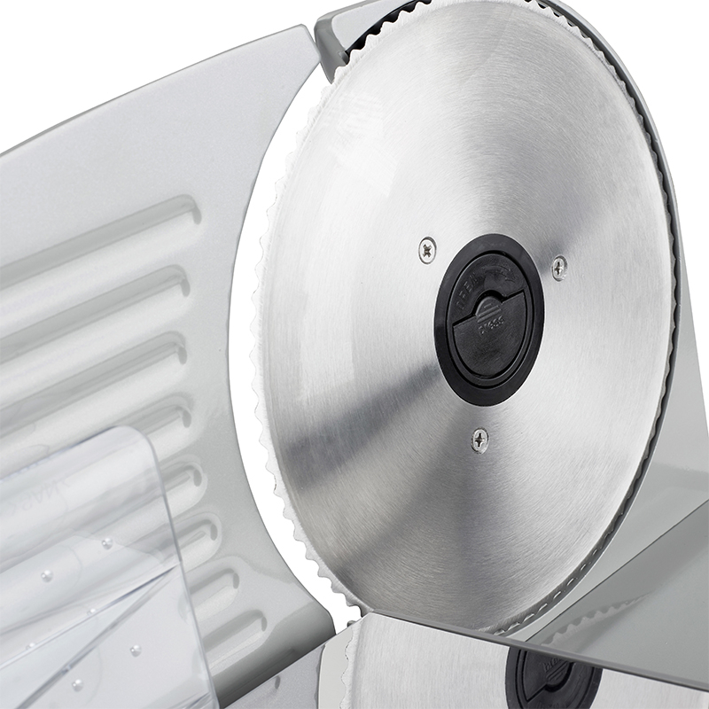 Feliator alimentar solid, din metal, echipat cu o masă din oțel inoxidabil și un împingător detașabil. Cuțitul din oțel inoxidabil de înaltă calitate permite felierea mezelurilor în felii subțiri, precum și obținerea unei felii substanțiale de pâine. Grosimea feliei poate fi ajustată liber. Este și mai ușor datorită unui indicator vizibil.