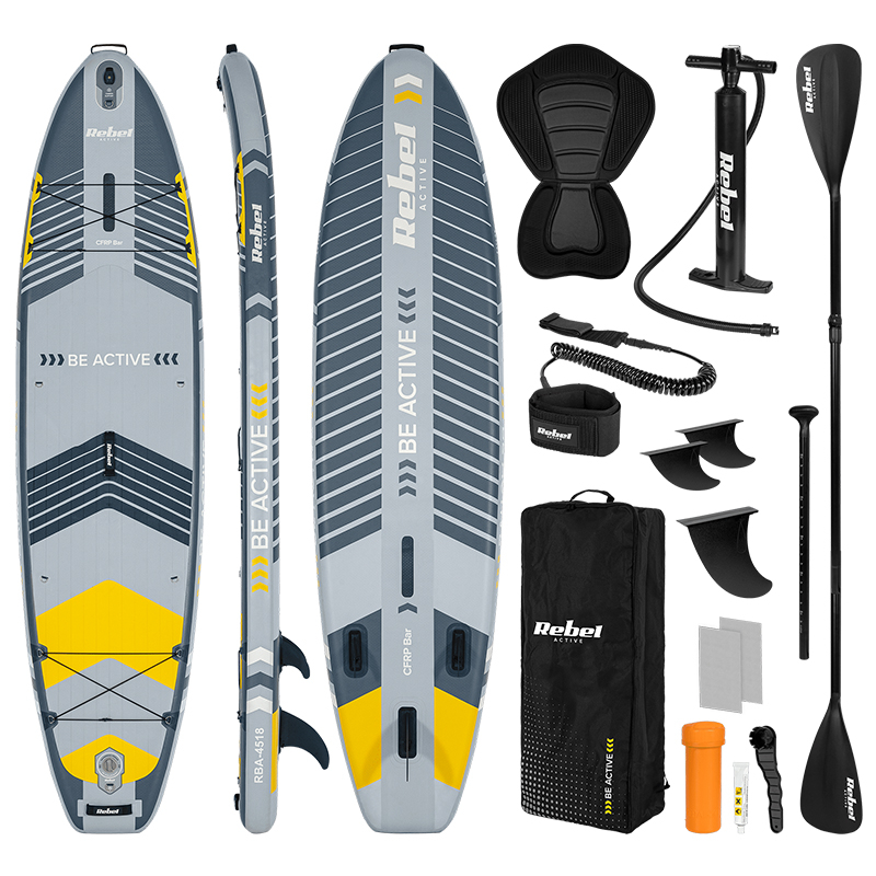 Include: 3 aripi glisante, sfoară, vâslă, scaun de caiac, pompă manuală, rucsac de transport, reparații kit (cheie valvă, 2 petice de reparare, lipici)