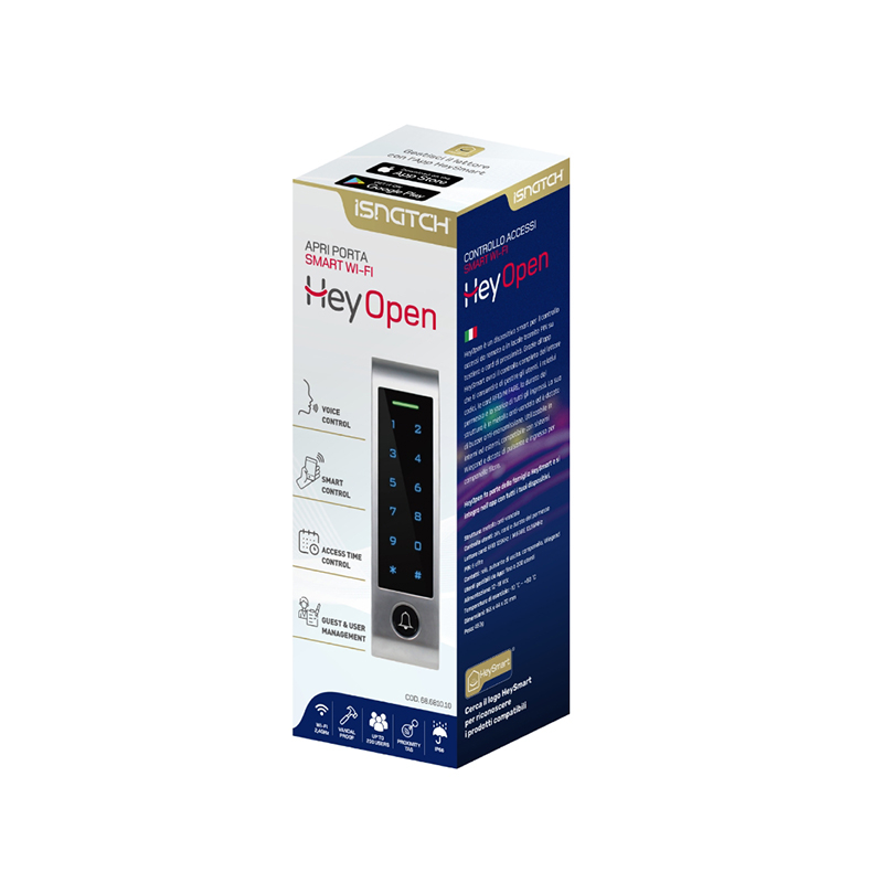 HeyOpen este un dispozitiv inteligent pentru controlul accesului de la distanță sau local prin PIN pe tastatură sau card de proximitate.