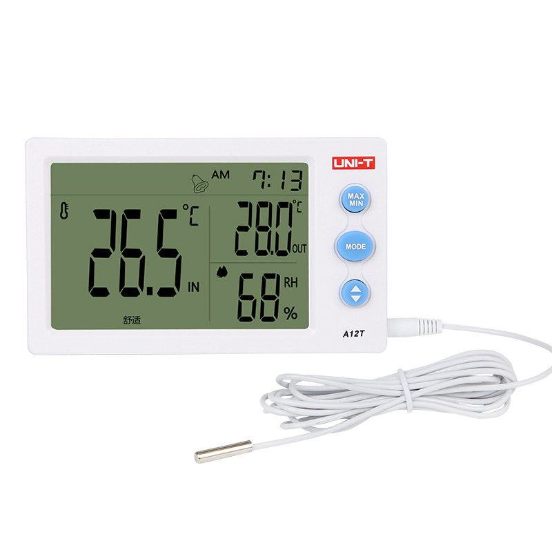 A10T / 12T măsoară temperatura și umiditatea în timp real și afișează citirile pe un ecran mare. Acestea pot fi utilizate atât pentru interior cât și pentru exterior. A12T dispune de o sondă suplimentară de senzor extern pentru măsurarea temperaturilor in două locații. Ambele aceste contoare au ceas deșteptător și mod deafisare timp 12/24H și afișează indicele de confort pe baza combinației dintre temperatură și umiditate.