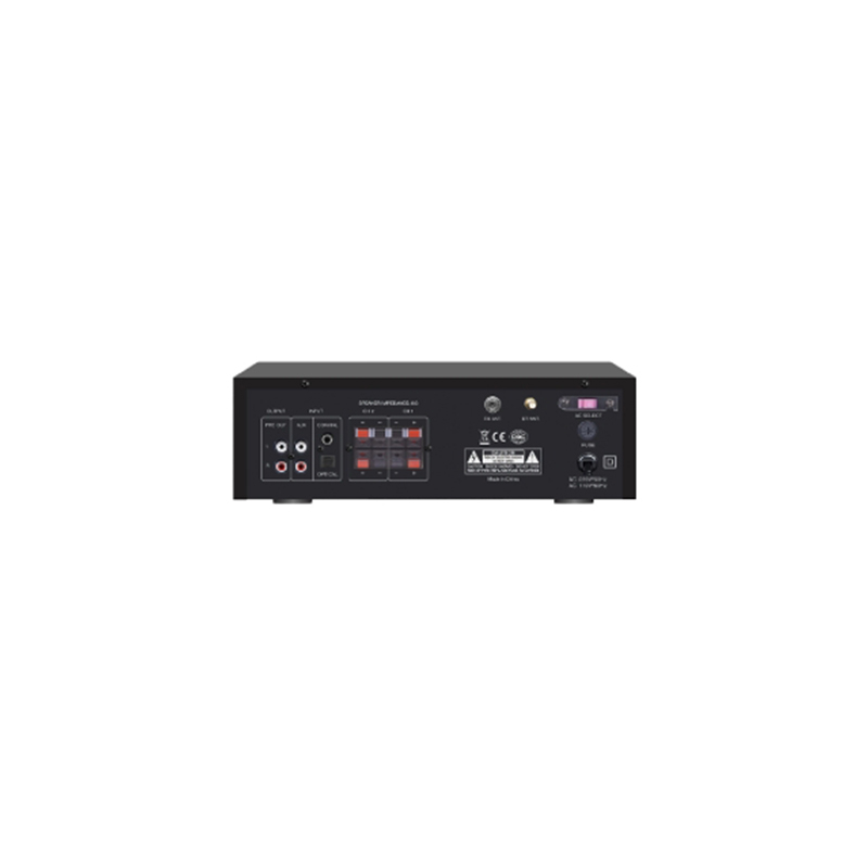 Amplificator PA cu Bluetooth pentru streaming de muzică, radio FM încorporat și slot pentru card MP3/SD. 2 amplificatoare audio de putere 8Ω de 100W (max), 2 canale de ieșire, egalizator și telecomandă.