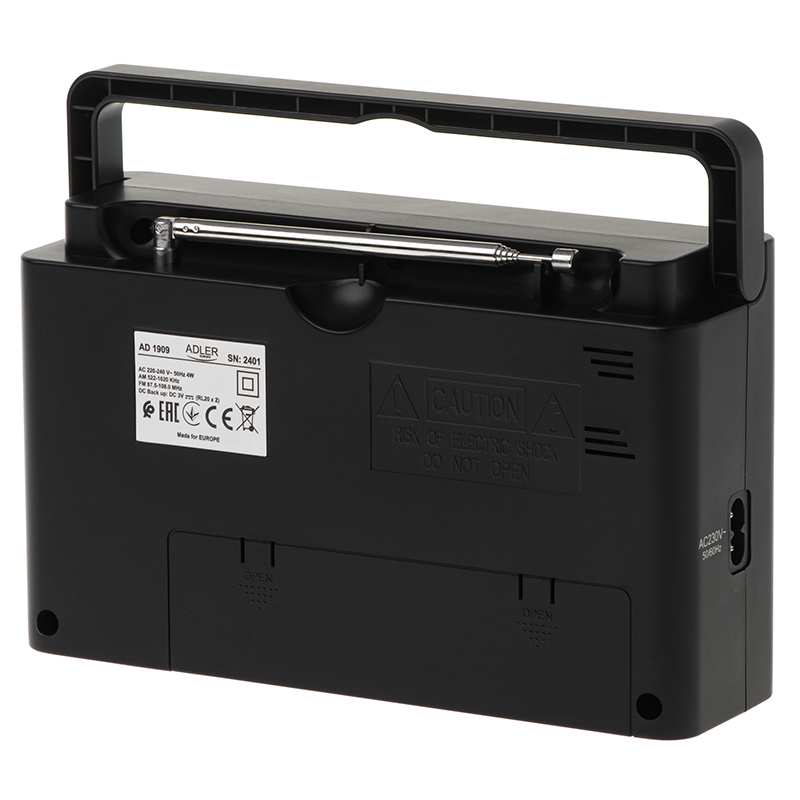 Radio-ul AD 1909 poate fi alimentat atât de la rețeaua electrică (220-240V~ 50 Hz), cât și cu baterii (2x RL 20). Astfel, puteți utiliza radio-ul oriunde, indiferent dacă aveți acces la o priză electrică sau nu.