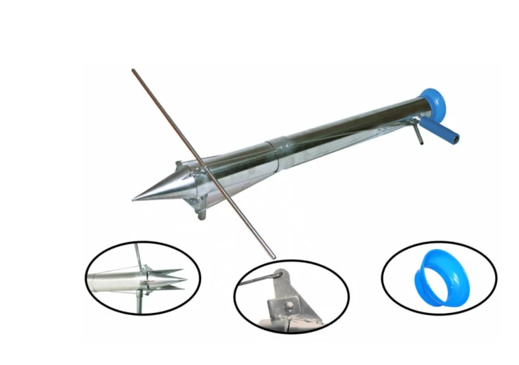 Plantator manual pentru rasaduri din material inoxidabil cu tub de directionare si o supapa care automatizeaza procesul de plantat rasaduri.